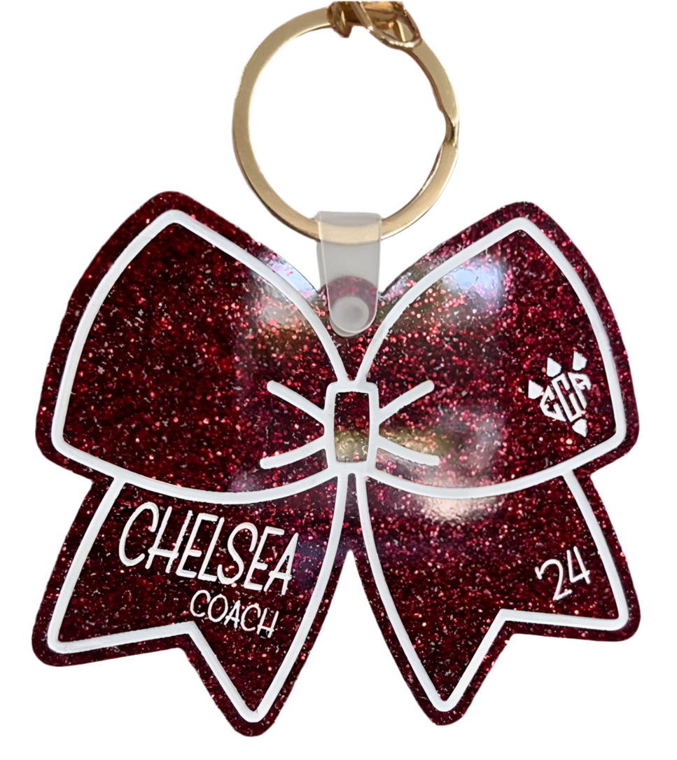 Keep your keys organized with our Personalised Coach Cheer Bow keyring, made from glitter acrylic for a touch of sparkle.